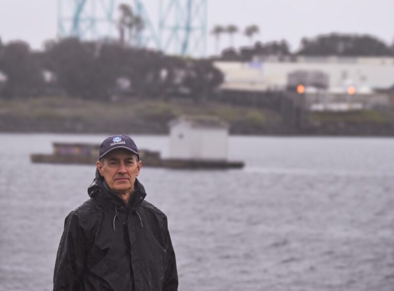 Phillip Musegaas, Executive Director of San Diego Coastkeeper. Behind him, SeaWorld and the barge from which it launches an excessive 150 fireworks shows each year.
