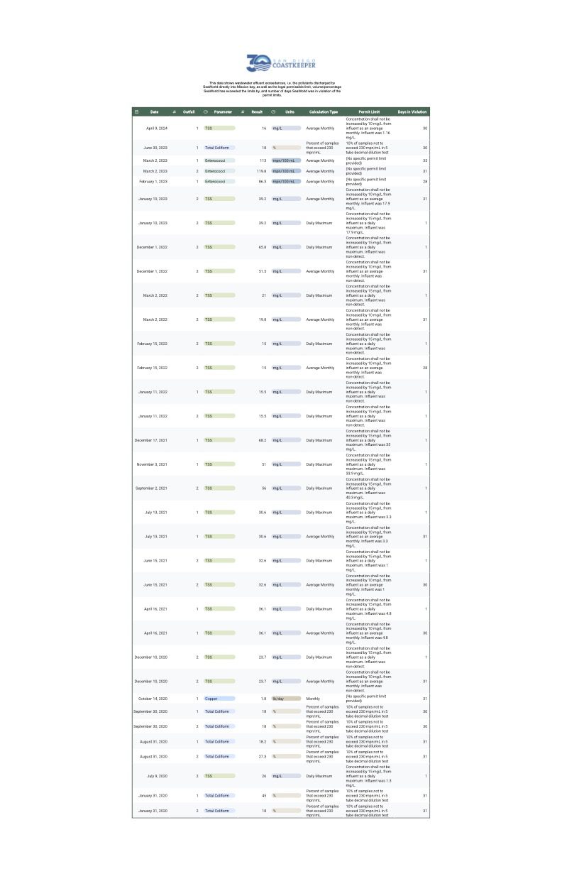 Water quality testing and SeaWorld’s own reporting show that the company routinely exceeded its effluent limitations for pollutants it discharged into public waters, including total coliform, total suspended solids (“TSS”), copper, and enterococci. Instead of properly treating wastewater from its aquarium tanks (which include marine mammal fecal matter), SeaWorld has violated its Waste Discharge Permit at least 500 days since January 1, 2020. It also repeatedly failed to report certain pollutant exceedances going back almost five years.