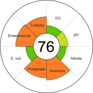 How to read our water quality pie charts: these handy charts are designed to give you a sense of which of the factors we measured contributed to the overall water quality score (the number in the center) for each watershed. The size/color of the pie slice gets larger/warmer with increased frequency and magnitude of deviations from good water quality standards for each indicator.