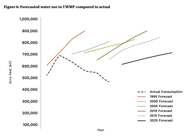 Water supply agencies throughout California are required to submit an Urban Water Management Plan (UWMP) every five years. These UWMPs must include a demand forecast — a long-term projection of how much water an agency will need to supply — that extends at least twenty-five years into the future. These projections lay the groundwork for how much water supply infrastructure to build, and relatedly how much debt to take on. As most major water supply projects cost billions of dollars to be paid down over multiple decades, getting the demand forecasting correct is critical. Underestimate demand, and you could run out of water. Overestimate demand, and you create multi-billion dollar stranded assets, and skyrocketing water rates.
