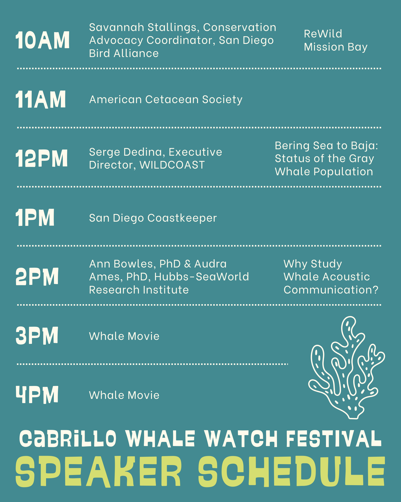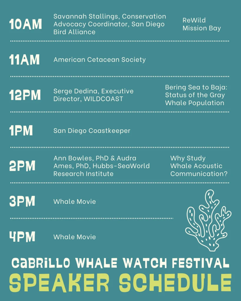 Cabrillo Whale Watch Festival is an all-ages celebration at Cabrillo National Monument, featuring exhibitors, speakers, hands-on crafts, guided land-based whale watching, and more!
